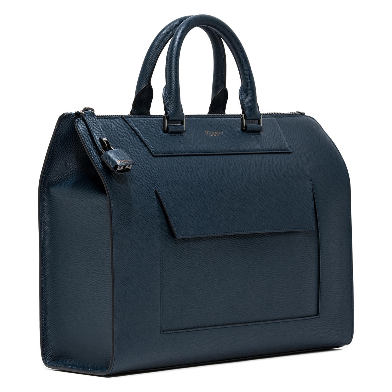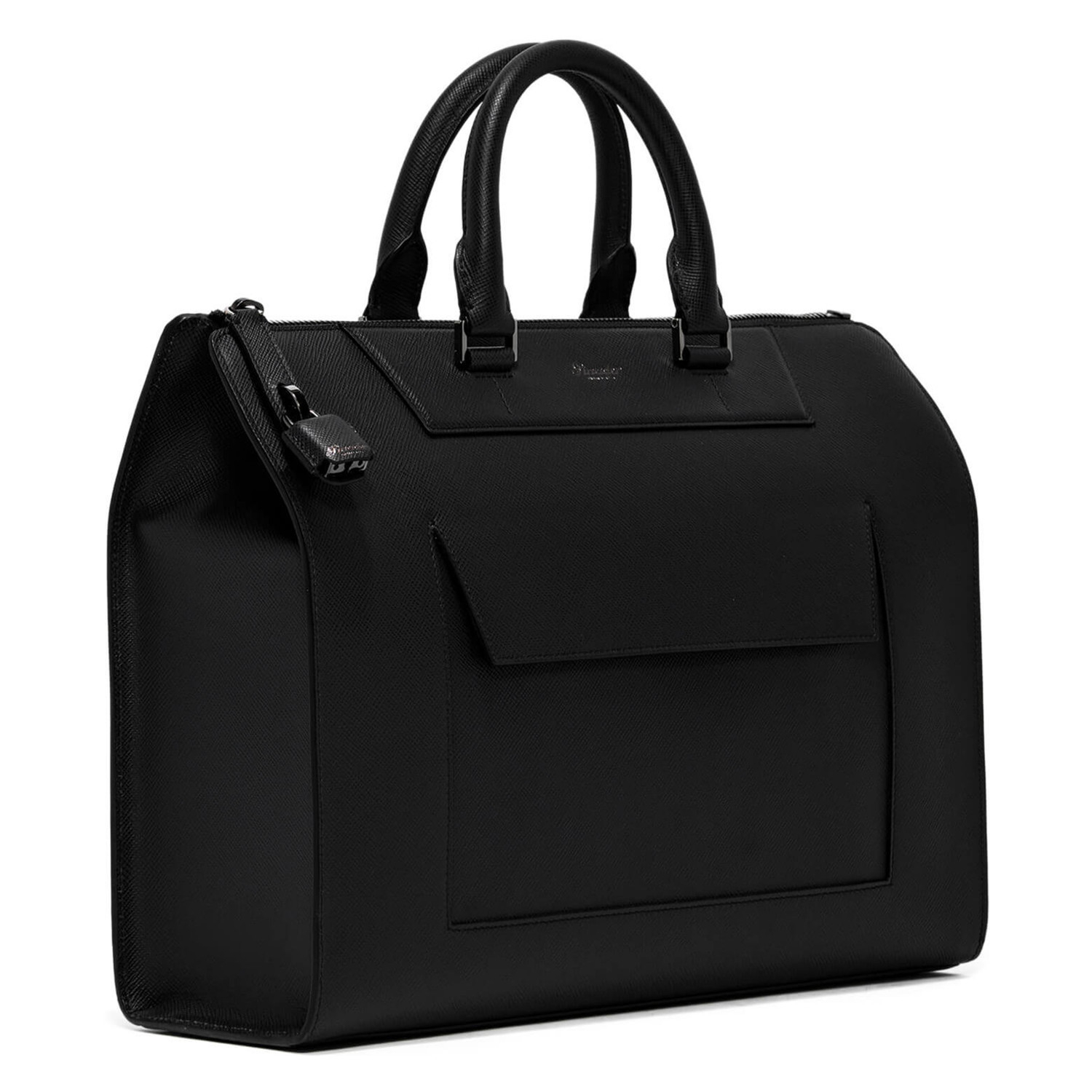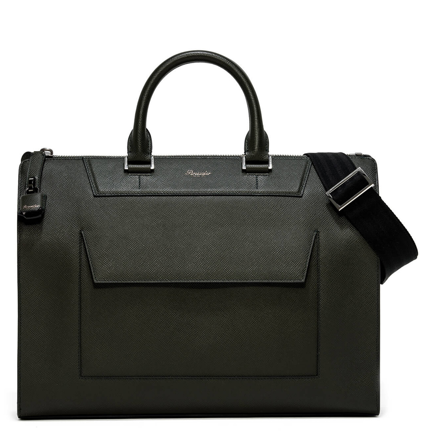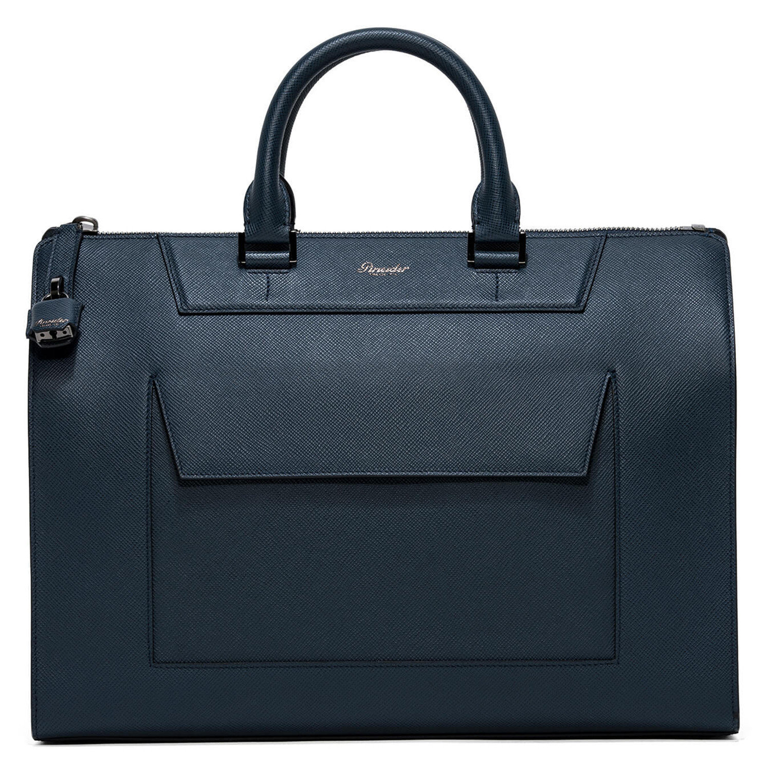 Mini Franzi oblique calfskin horizontal bag with 2 horizontal handles, zip closure and safety lock. Adjustable and removable shoulder strap, quick zip pocket. Personalized Pineider. Made in Italy. External pocket with magnetic closure. The interior features 1 padded laptop paded compartment, 1 large zip pocket, 1 ticket pocket, 2 storage pockets and a flat pen pocket.