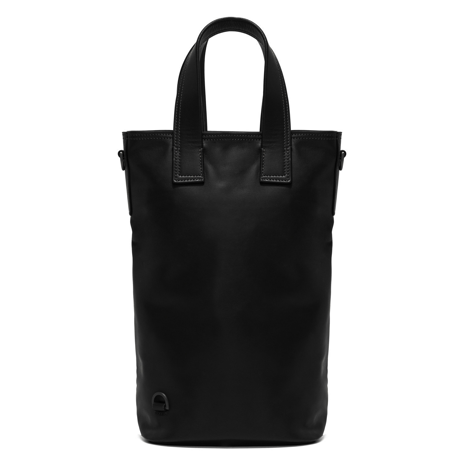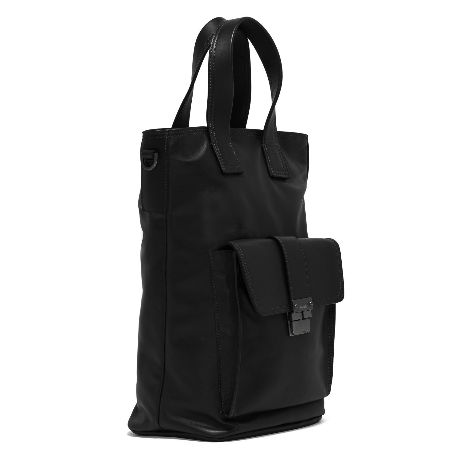 Tote bag in palmellato calfskin. Oneway hidden zip. Front pocket with flap and personalized lock. Polyester adjustable shoulderstrap. Lining 100% cotton. Brushed rhutenium hardware. Made in Italy.